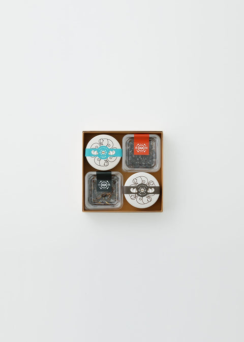 クルミのおやつ(大野醤油、黒糖カラメル)各1個、昔ながらの佃煮(ほたるいか、ごり、花くるみ、潮騒くるみ)各1個